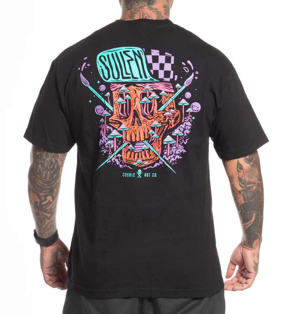 Cosmic flips our classic Sullen Badge into a cartoon skull-in-orbit—happy-scary grin, mushrooms rising, checker pop. Part of the Fungi Capsule, printed on our black Standard Tee for a clean fit and everyday wear.