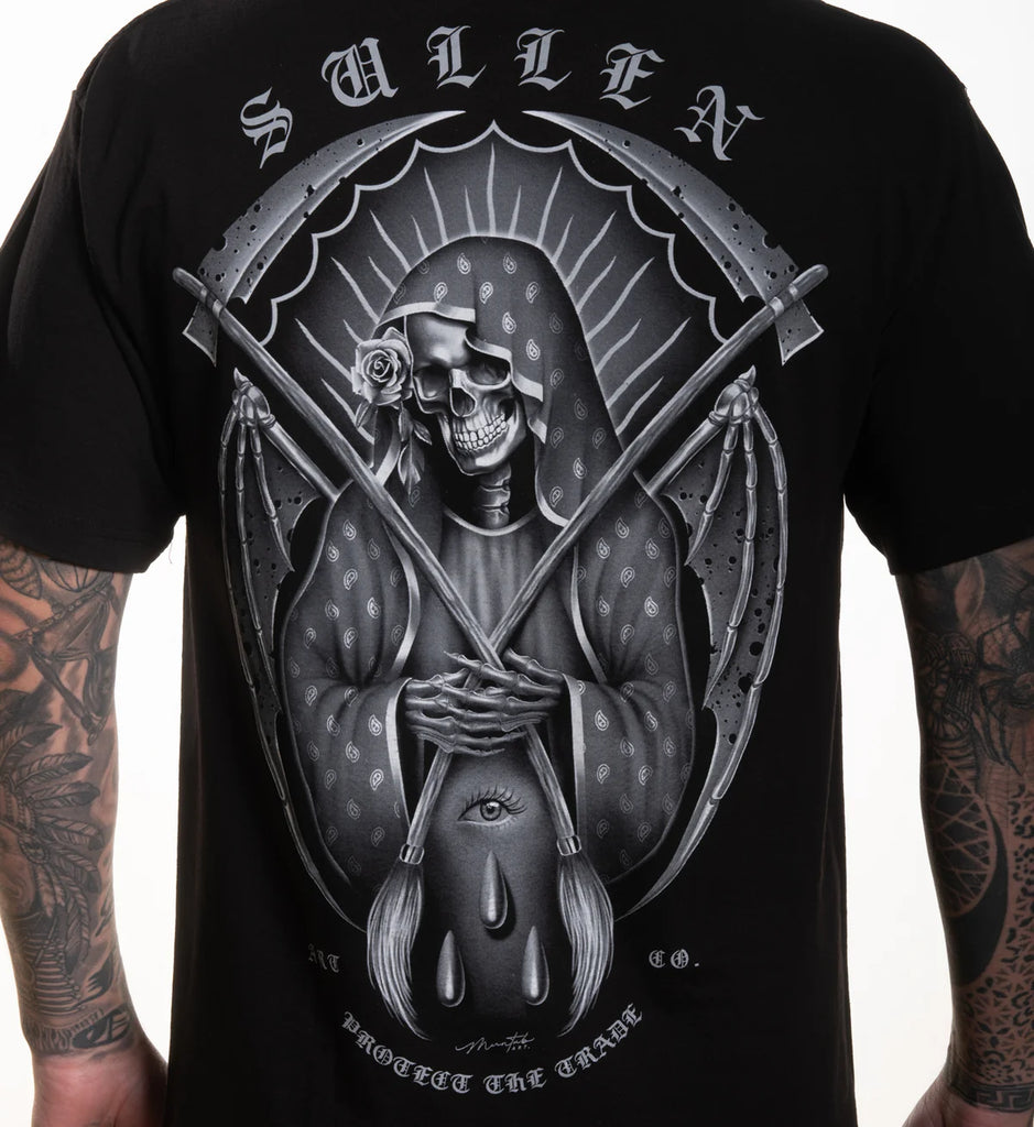 De La Muerte lands in black-and-grey: veiled reaper in a paisley shroud, rose at the ear, wings folded, and an arched halo. Crossed scythes nod to the Sullen Badge, with the teardrops seal and Protect the Craft callout below. Part of the Reapers Capsule, printed on our Standard Tee for a clean, everyday fit.