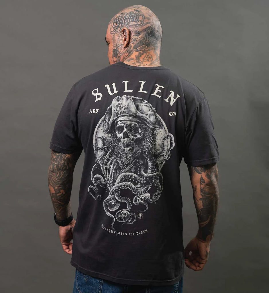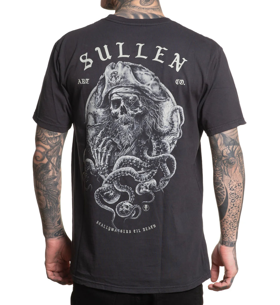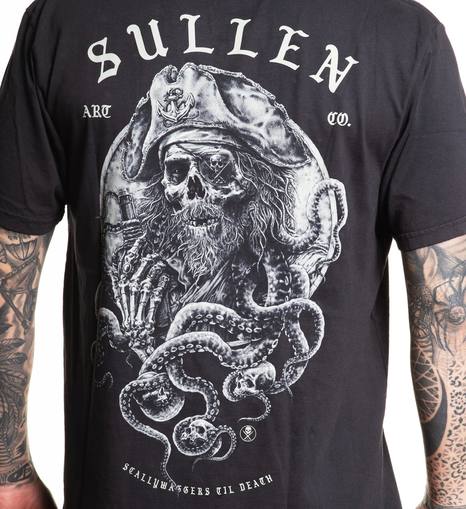 Scallywaggers pulls a ghost captain from the deep—eyepatch under an anchor-marked tricorn, tentacles winding through the frame, skulls in the curl. Monochrome ink on washed black, finished with “Scallywaggers ’Til Death.” Part of our Pirates Capsule, printed on our premium tee for a soft feel and a clean, everyday fit.