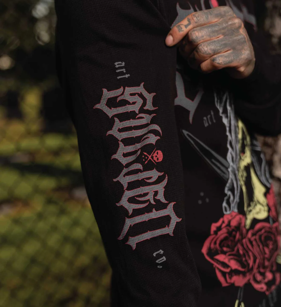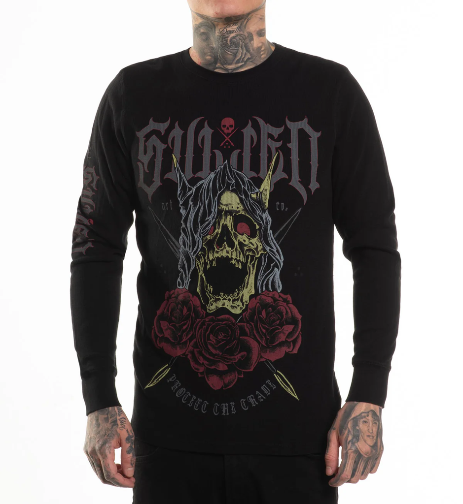 Built for cold fronts. Tempest throws a horned skull over blood-red roses with crossed blades and a “Protect the Grave” arc—gothic type up top, sleeve hit down the right, all in dark, weathered inks. Printed on our waffle-knit thermal—warm, breathable, and ready to layer. Rib cuffs lock heat, the fit stays true without squeezing.