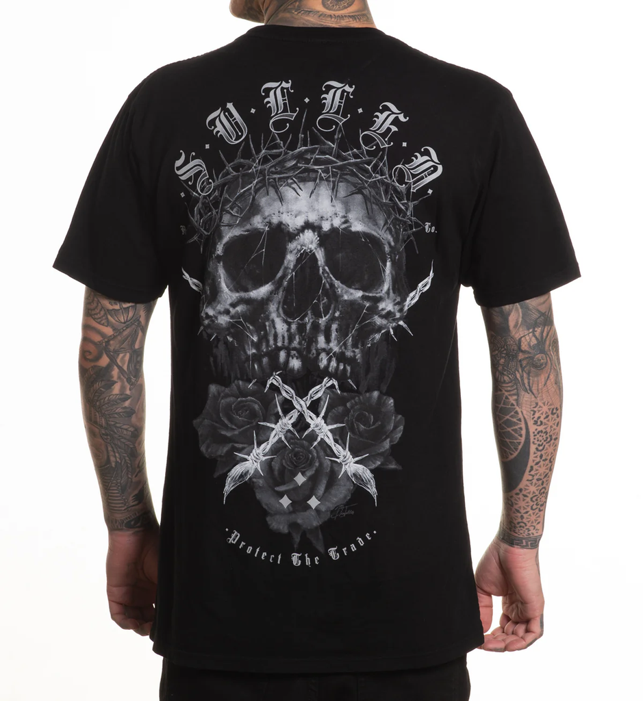 Barbed wire and black roses frame this weathered skull under an old-English, finished with “Protect the Trade” at the hem. Crossed brushes nod the Badge—dark, gritty, and unmistakably Sullen. Printed on our Jet Black premium tee for a tailored fit and soft hand feel.
