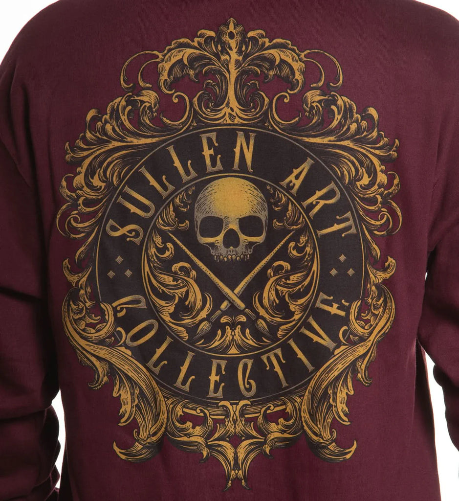 The Filigree Badge takes our classic badge and drops it into a gold-framed crest across rich burgundy cotton. Black base print with washed gold scrollwork gives it that old-world trophy feel. Clean front pocket hit, heavy hit on the back—built for anyone who wants their BOH logo turned all the way up.